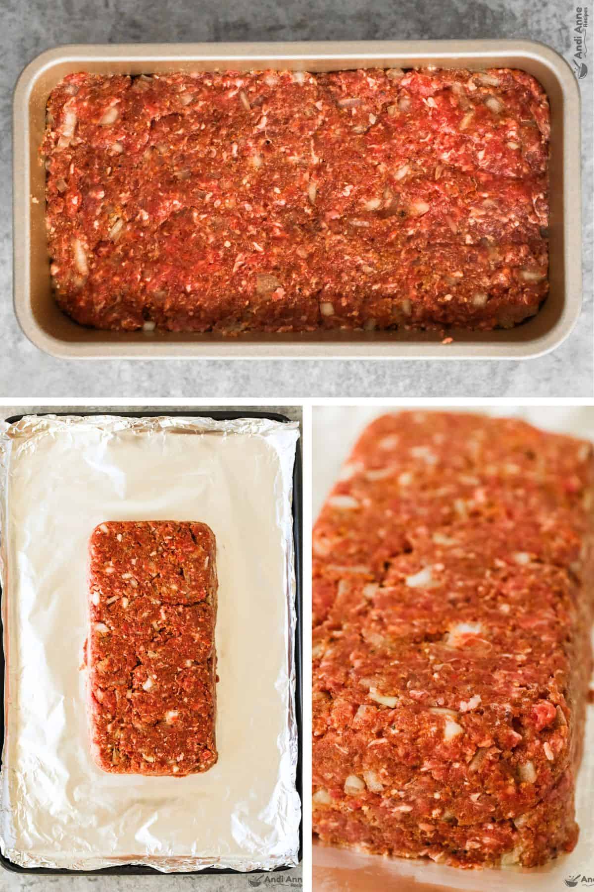 - Create a loaf shape by forming with your hands or by packing the beef mixture into a greased loaf pan and then flipping it over onto the baking sheet. Remove the loaf pan and it will create the perfect loaf shape.