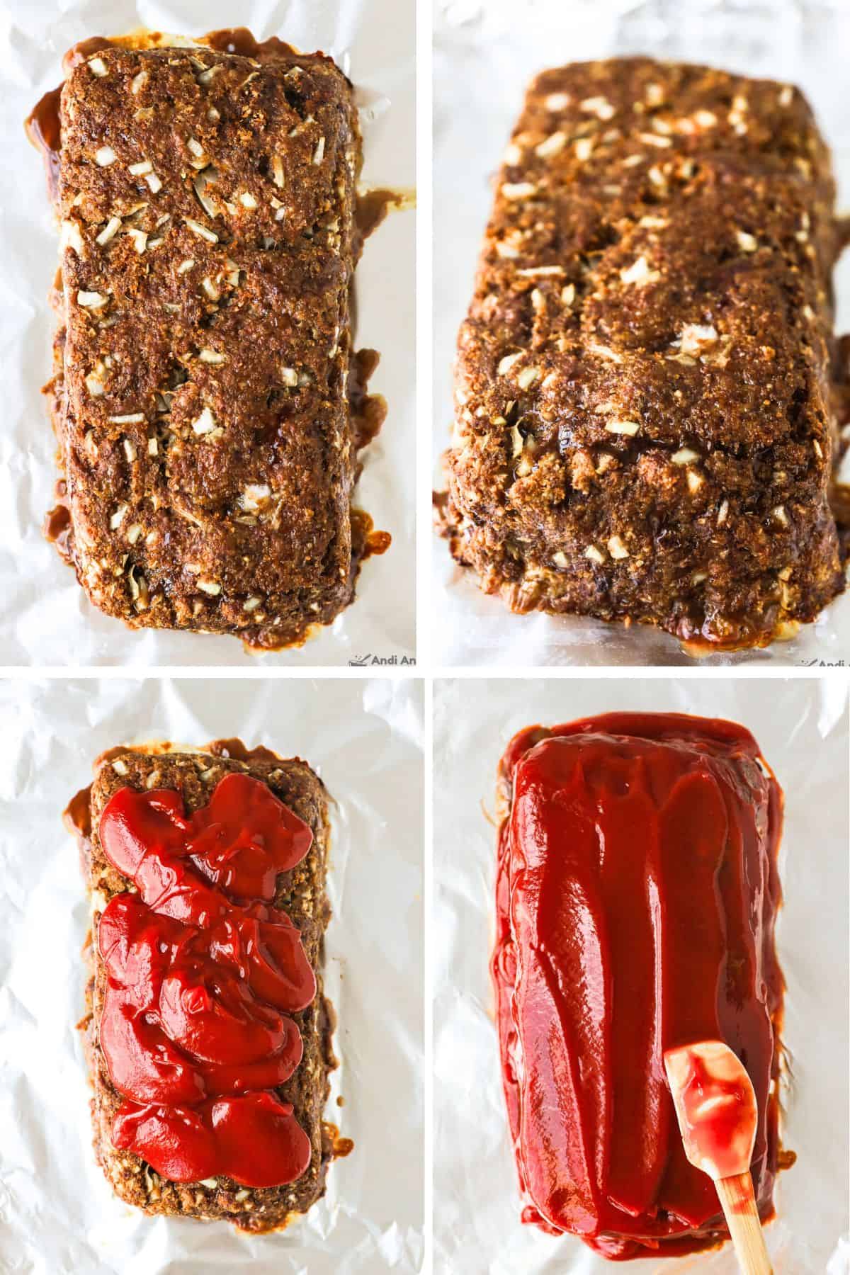 - Bake the meatloaf uncovered and without the sauce topping for 40 minutes. While the meatloaf is cooking, mix together the ketchup and white vinegar. Remove the meatloaf from the oven and spread the ketchup mixture along the top and sides. Bake uncovered for another 10 minutes or until fully cooked inside.