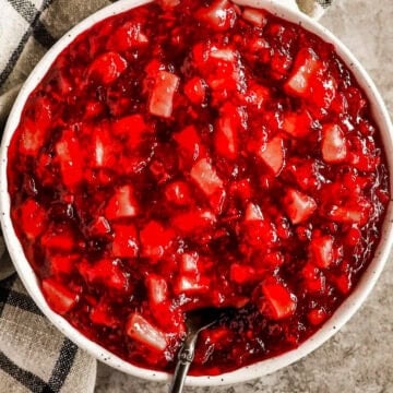Cranberry jello salad is a classic American holiday side made from whole berry cranberry sauce, crushed pineapple, chopped apples, strawberry gelatin and boiling water.