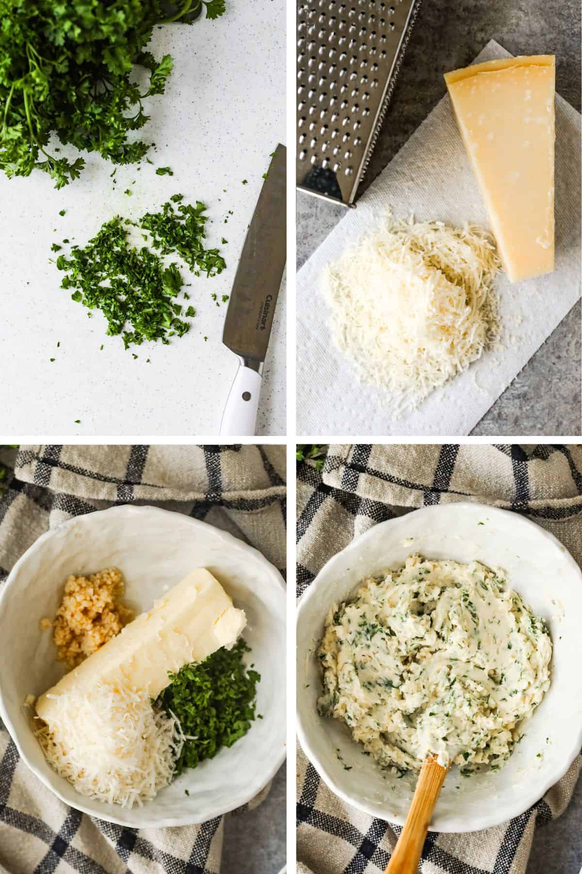 In a small bowl, mix together ½ cup softened salted butter, 4 minced garlic cloves (about 2 tsp), 2 Tbsp chopped parsley, and ¼ cup grated Parmesan cheese (if using). Stir until smooth and creamy.