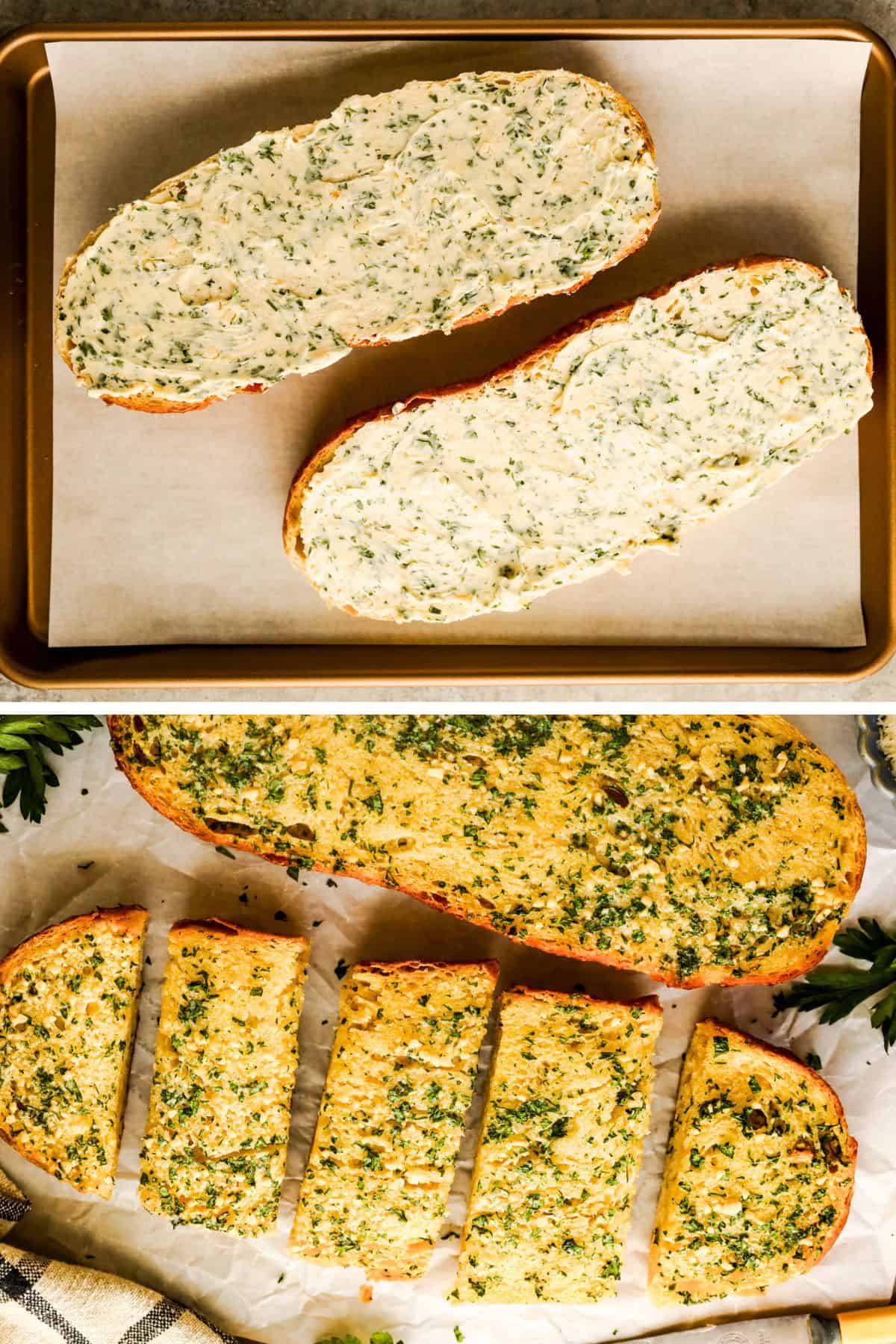 - Spread garlic butter mixture (½ cup butter, 4 minced garlic cloves, 2 Tbsp parsley, ¼ cup Parmesan) evenly over sliced French or Italian bread.
